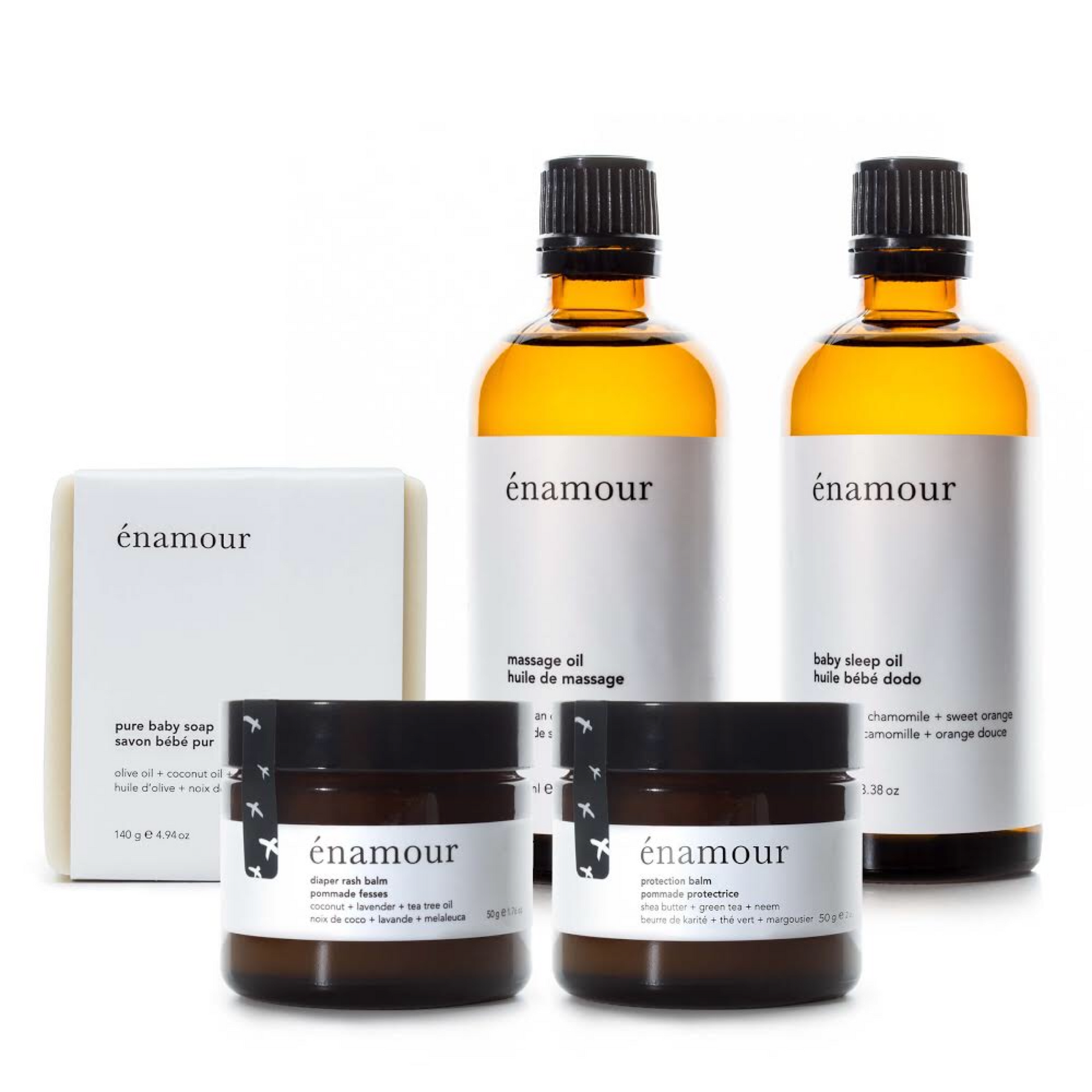 Offrez à vos proches les bienfaits des produits de soin pour bébé 100% naturels avec le Kit Baby Shower Énamour. Il comprend notre huile de massage, huile de sommeil, savon pur, baume de protection et baume contre l’érythème fessier. Des soins doux pour toute la famille, sans parfum artificiel. Découvrez également notre Kit de Démarrage pour plus d'inspiration.