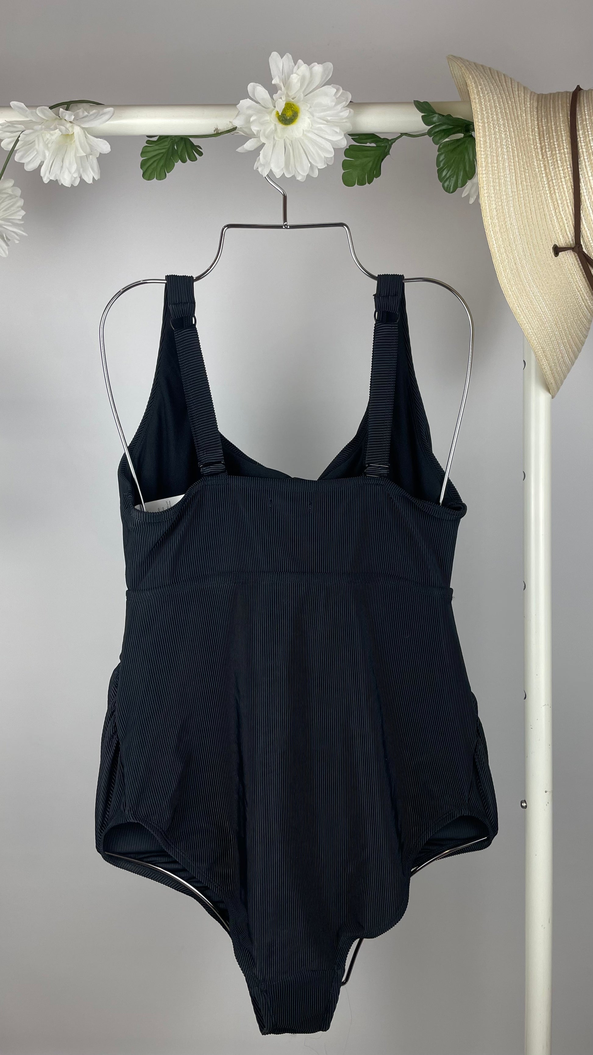 Bretelles ajustables, coussinets amovibles. Noir texturé côtelé.